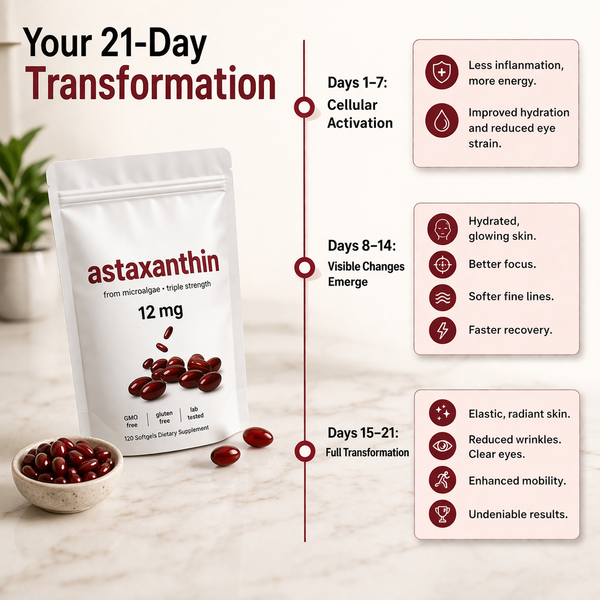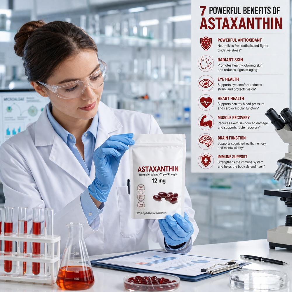 Introducing Astaxanthin — the ultimate internal skincare supplement. A powerful natural antioxidant that works at the cellular level to repair, protect, and restore your skin from within.